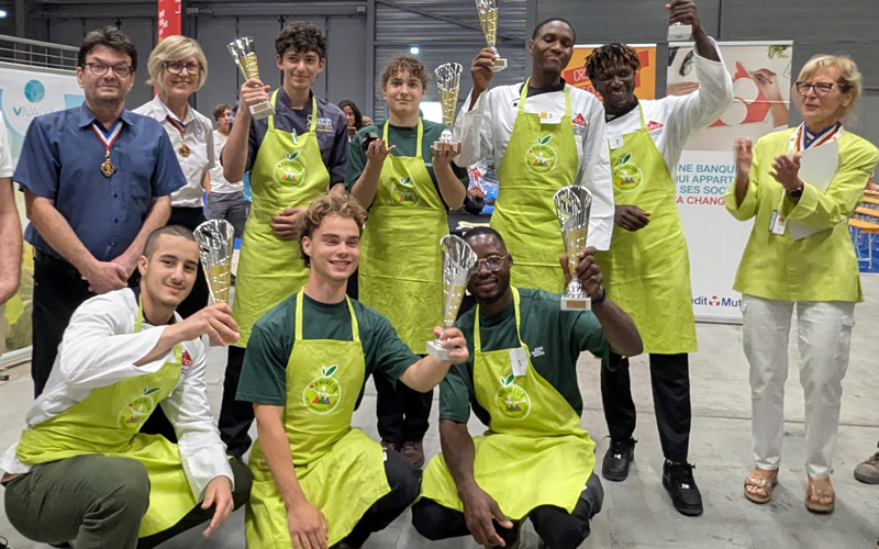 Au final, ces 4 apprentis primeurs (debout au 2e rang sur la photo ci-dessous) se sont démarqués aussi bien par leurs connaissances, leur maîtrise du geste professionnel et leur créativité : Elya Pinto-Latrei, 17 ans, apprentie à la ferme école Graines d’Avenir (78), Fodé Camara, 18 ans, apprenti au Cifca (75), Clovis Monnet, 17 ans, apprenti au Campus de Groisy (74), et Moussa Diakité, 18 ans, apprenti au Cifca (75).